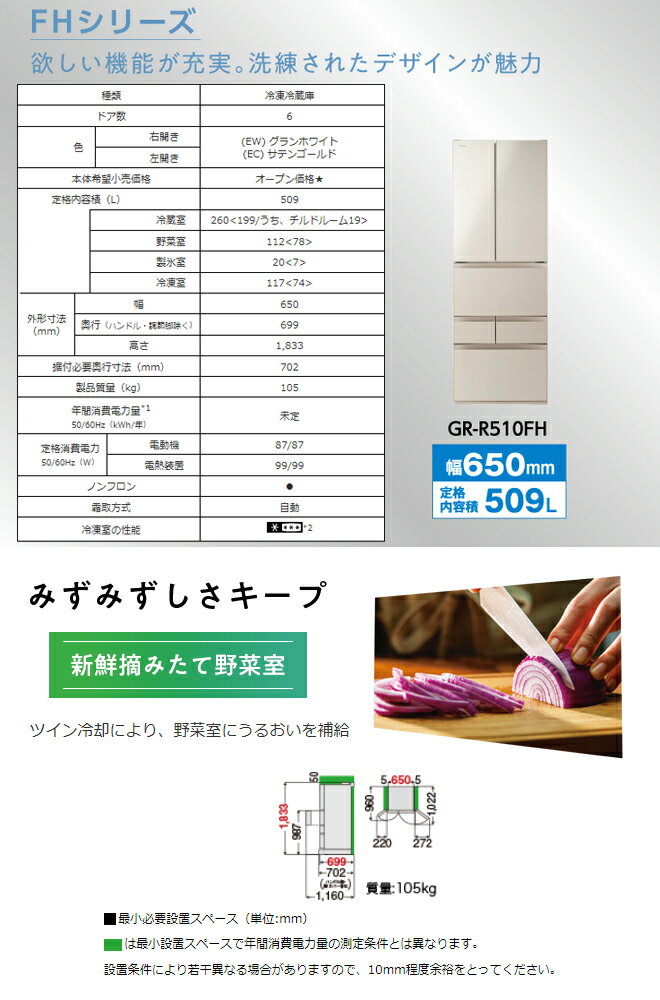 洗練されたデザインが魅力新鮮ツイン冷却システムみずみずしさキープ:新鮮摘みたて野菜室使い勝手バツグン:野菜室がまんなかそうじ口おいしさ長持ち:速鮮チルド、解凍モード幅65cmなのに500Lの大容量を実現!「マジック容量」高級感とスタイリッシュさを演出する「クリアガラス面材」強度と清潔さを両立した強化処理ガラス棚採用外形寸法(mm):幅650×奥行(ハンドル・調節脚除く)699×高さ1833据付必要寸法(mm):幅660×奥行702×高さ1883※設置条件により若干異なる場合がありますので、10mm程度余裕をとってください。