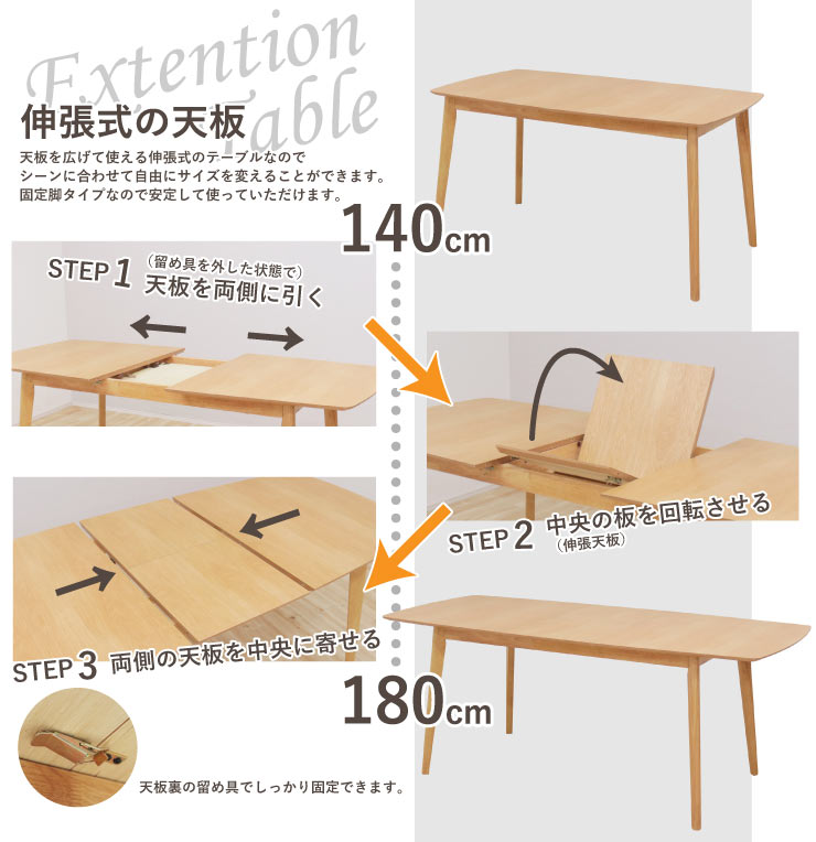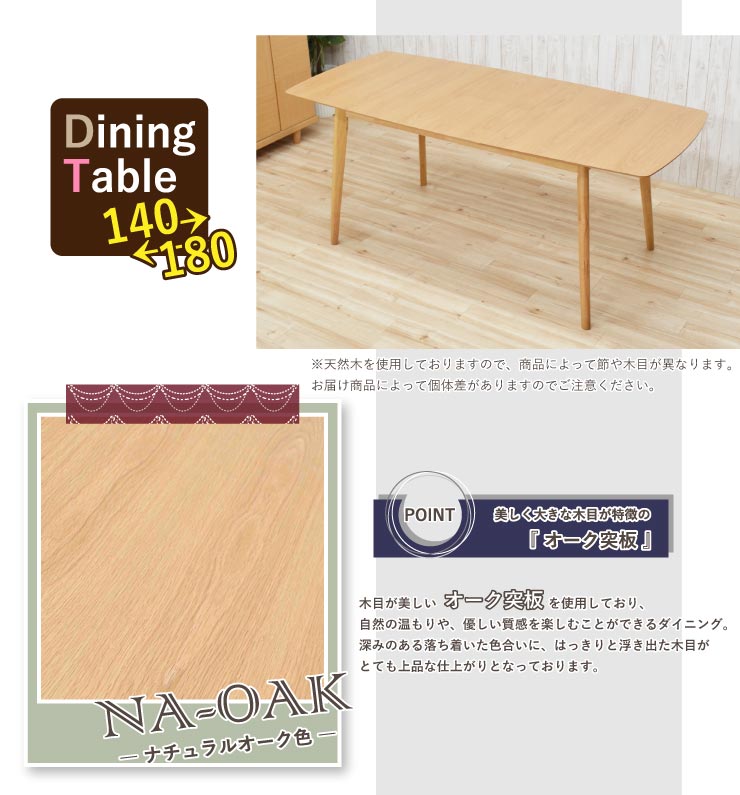 仕 様 サイズ材質 【輸入品】 ダイニングテーブル【組立品】 幅1800/1400mm×奥行き800mm×高さ720mm 材質:オーク突板/MDF/ラバーウッド ダイニングチェア【完成品】 幅460mm×奥行580mm×高さ870mm(座面高450mm) 材質:ファブリック/ラバーウッド ラッカー塗装 特徴 新品の通常在庫品ですが、特別価格のため【アウトレット品】扱でおねがいいたします。