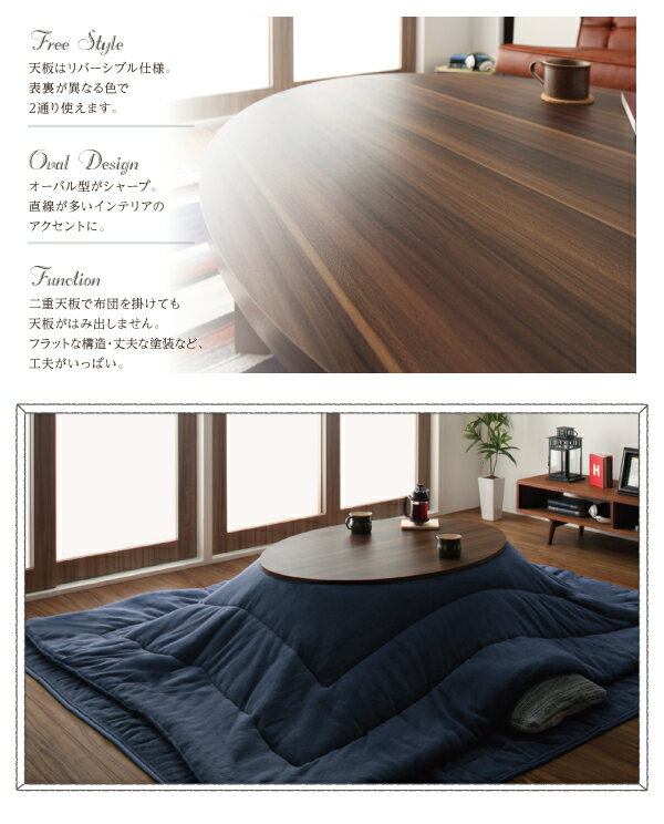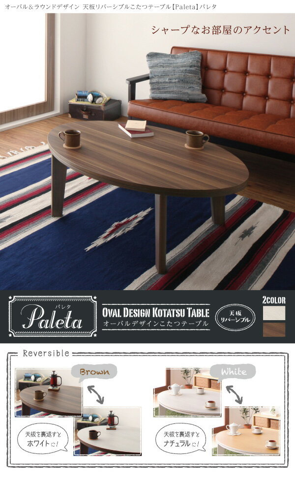 オーバルデザイン 天板リバーシブル こたつテーブル 【Paleta】パレタ 楕円形(105×75) ブラウン×ホワイト一人でも二人でも使いやすい105×75のベストバランス。