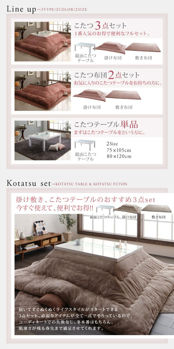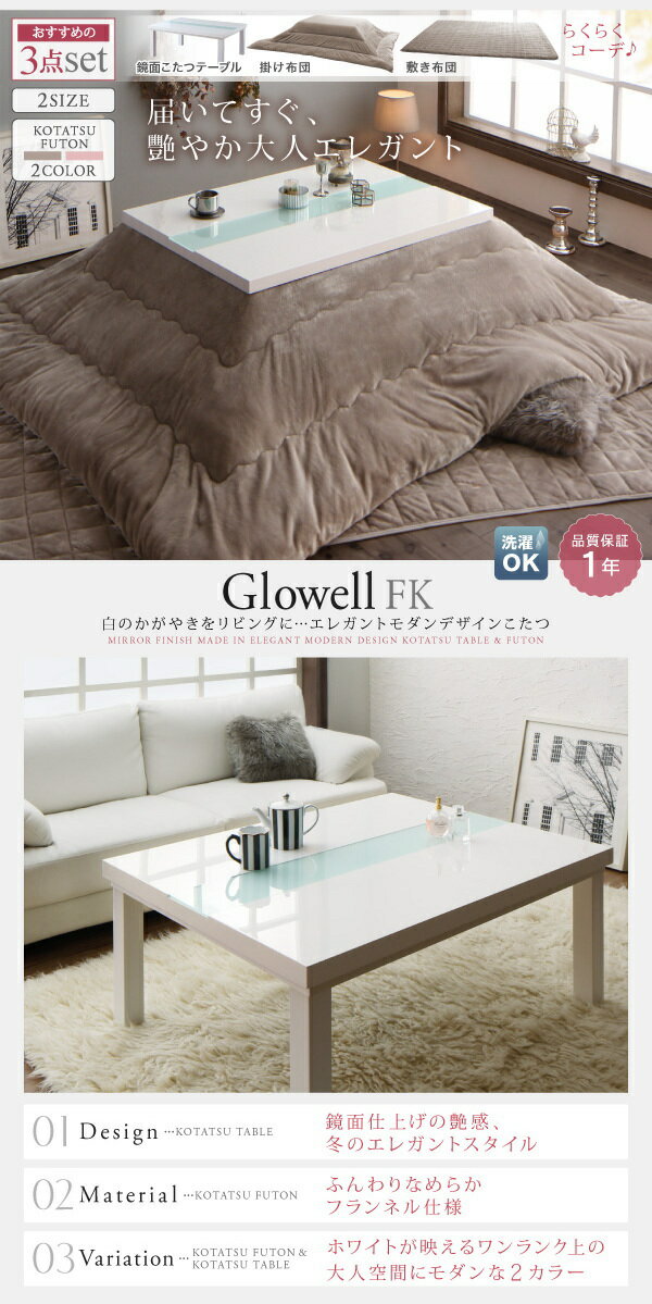 鏡面こたつテーブル/掛け布団/敷き布団/らくらくコーデ! 01.鏡面仕上げの艶感、冬のエレガントスタイル 02.こたつ布団はふんわりなめらかフランネル仕様 03.ホワイトが映えるワンランク上の空間にモダンな8種類展開 商品名 エレガントモダンデザインこたつ Glowell FK グローウェル エフケー こたつテーブル単品 鏡面仕上 長方形(75×105cm) 配送について こちらの商品はメーカーより直送致します。