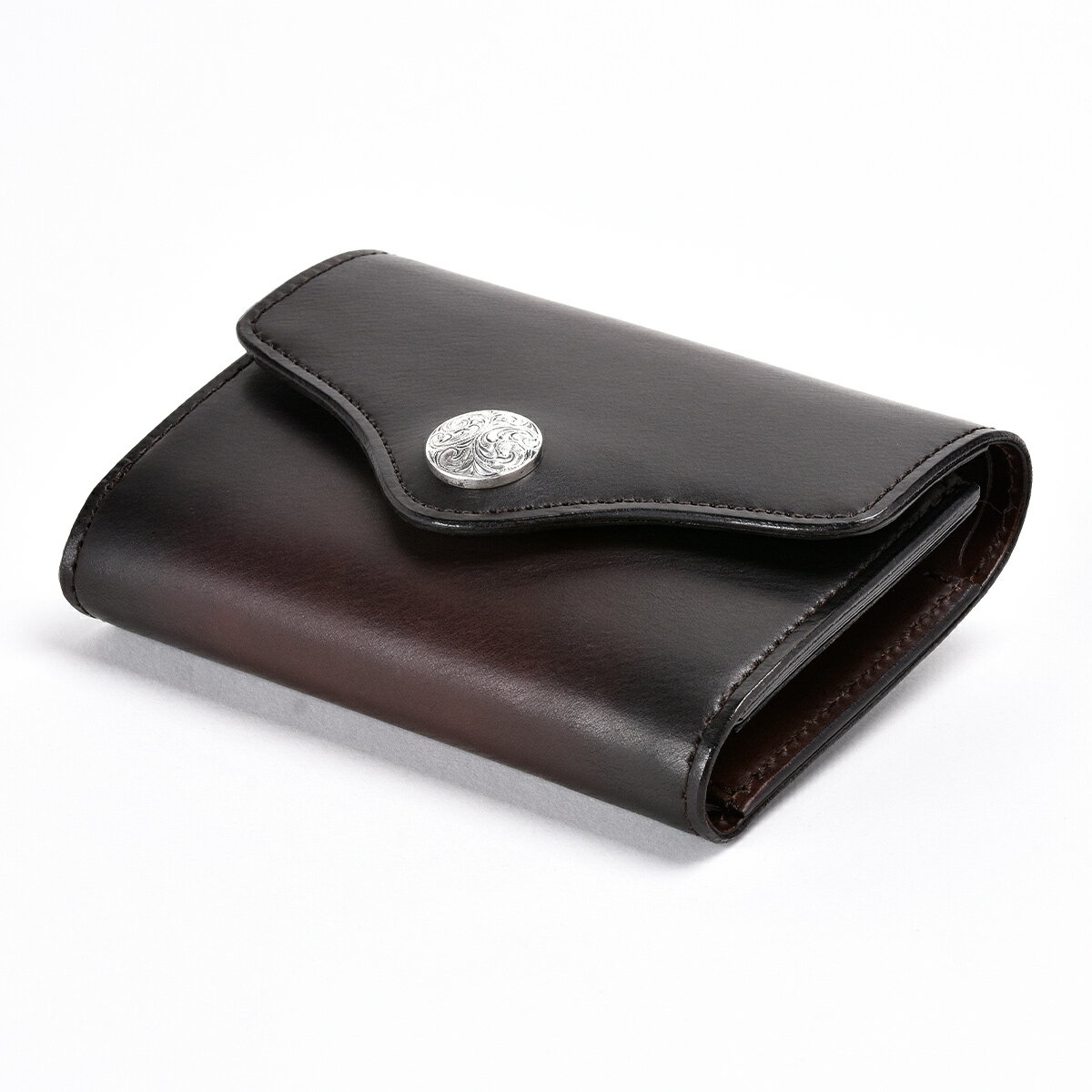 メーカー名FUNNY ORIGINAL(ファニー オリジナル)品名COSMO(コスモ) 素材/カラーOSCURO 外装:ブライドルレザー(牛皮革)/オスクーロ/手染め 内装:牛皮革/ブラウン パーツエングレーブコンチョ 素材:ピューター(純銀メッキ/イブシ仕上げ) サイズ:18mm サイズW120 × H93(mm) 仕様カードホルダー:6ユーティリティ・スペース:2小銭入れ:1札入れ:1 ※ユーティリティ・スペースにカードは入ります ※小銭入れと札入れには仕切りはありません ●弊社の皮革製品は、皮革の持つ優れた特徴と質感の高い素材そのものの魅力を前面に押し出して仕上げるため、表面にしみや汚れ、傷が付きやすく、生体時の傷やシワなどが革の表面に残ります。